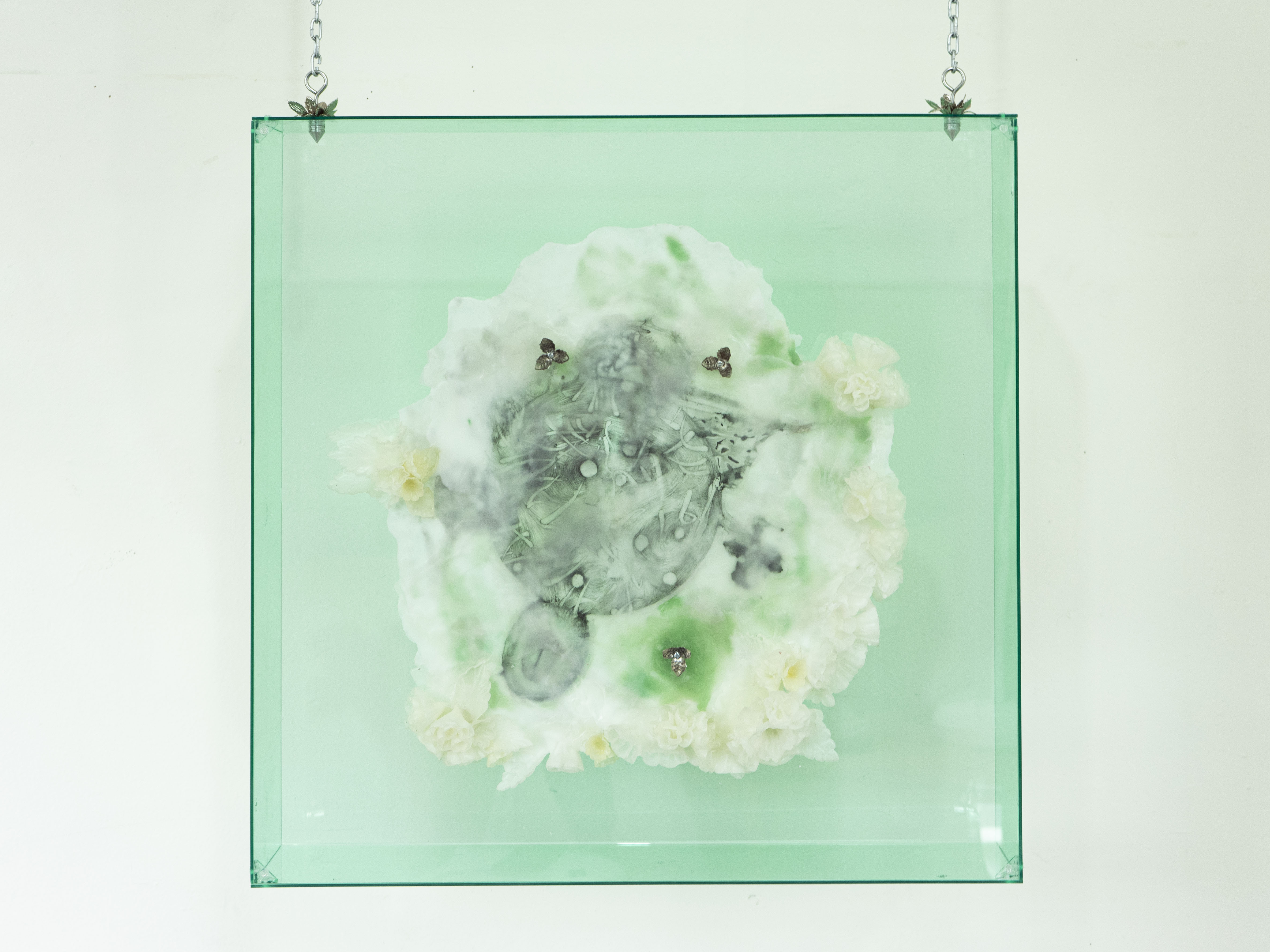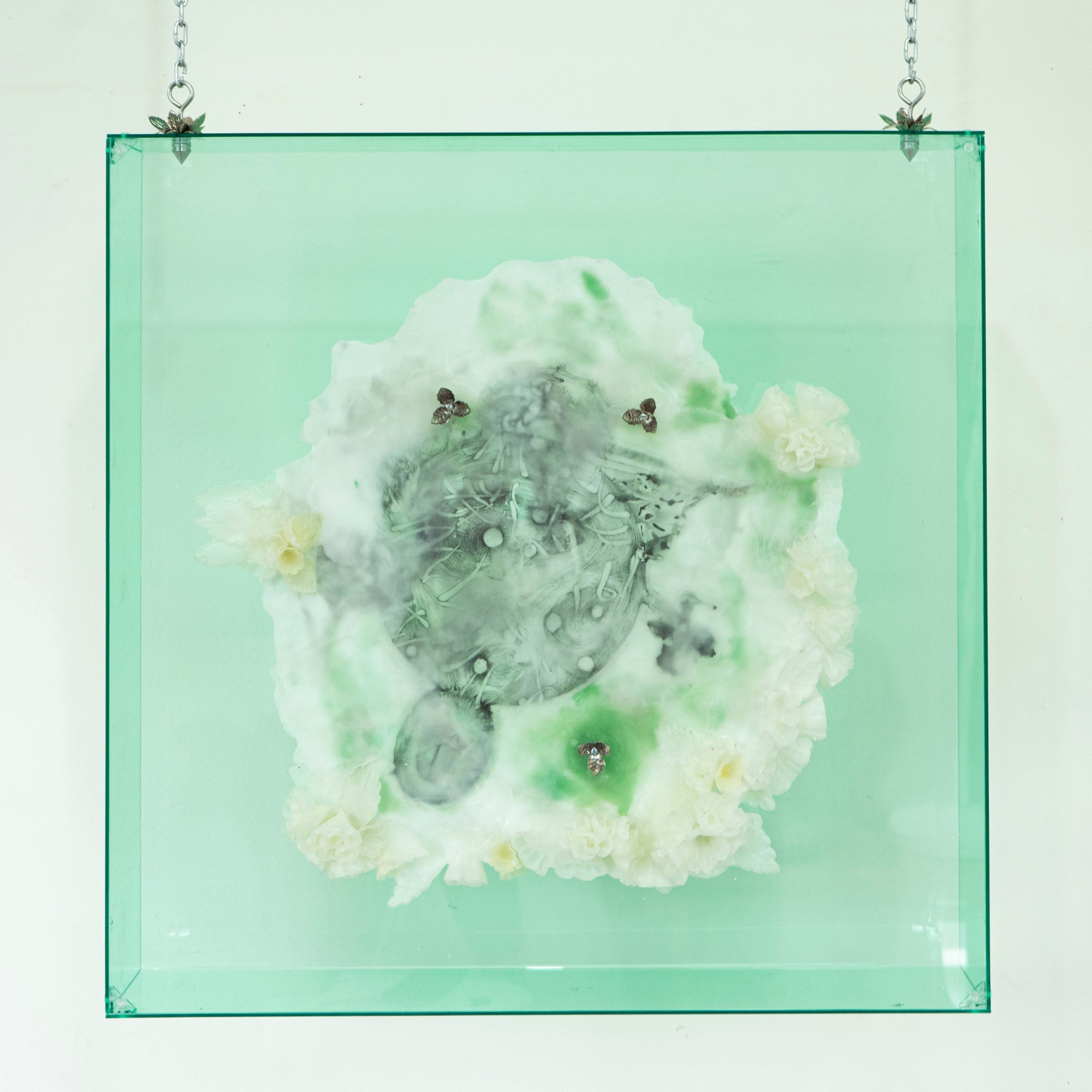 Técnica: Cera encáustica, cera escamada, lápiz grafito y tinturas vegetales, sobre papel. Apliques de latón, aluminio y caja de metacrilato.